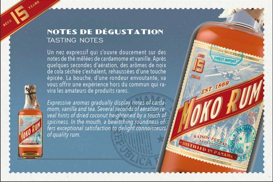 MOKO Rum 15 Jahre ist ein edler Rum, gereift in Panama und veredelt in Frankreich. Nach 15 Jahren Reifung in Bourbonfässern erhält er durch ein sechsmonatiges Finish in Cognacfässern bei Maison Peyrat eine besondere Eleganz. Duftnoten von Kardamom, Vanille, Tee und Kokos treffen auf einen Geschmack von gerösteten Nüssen und feiner Würze. Ideal pur, auf Eis oder zu einer Käseplatte.